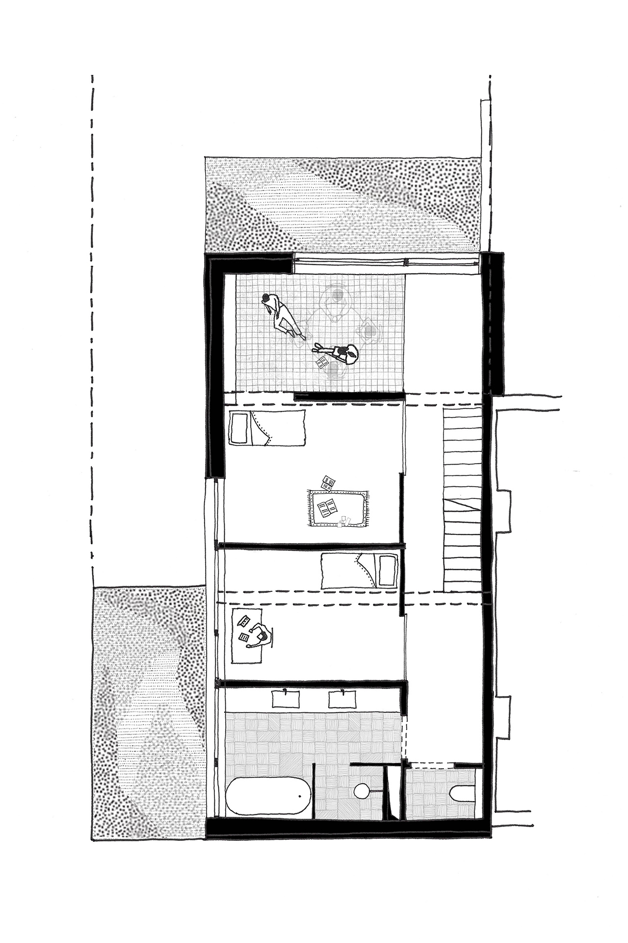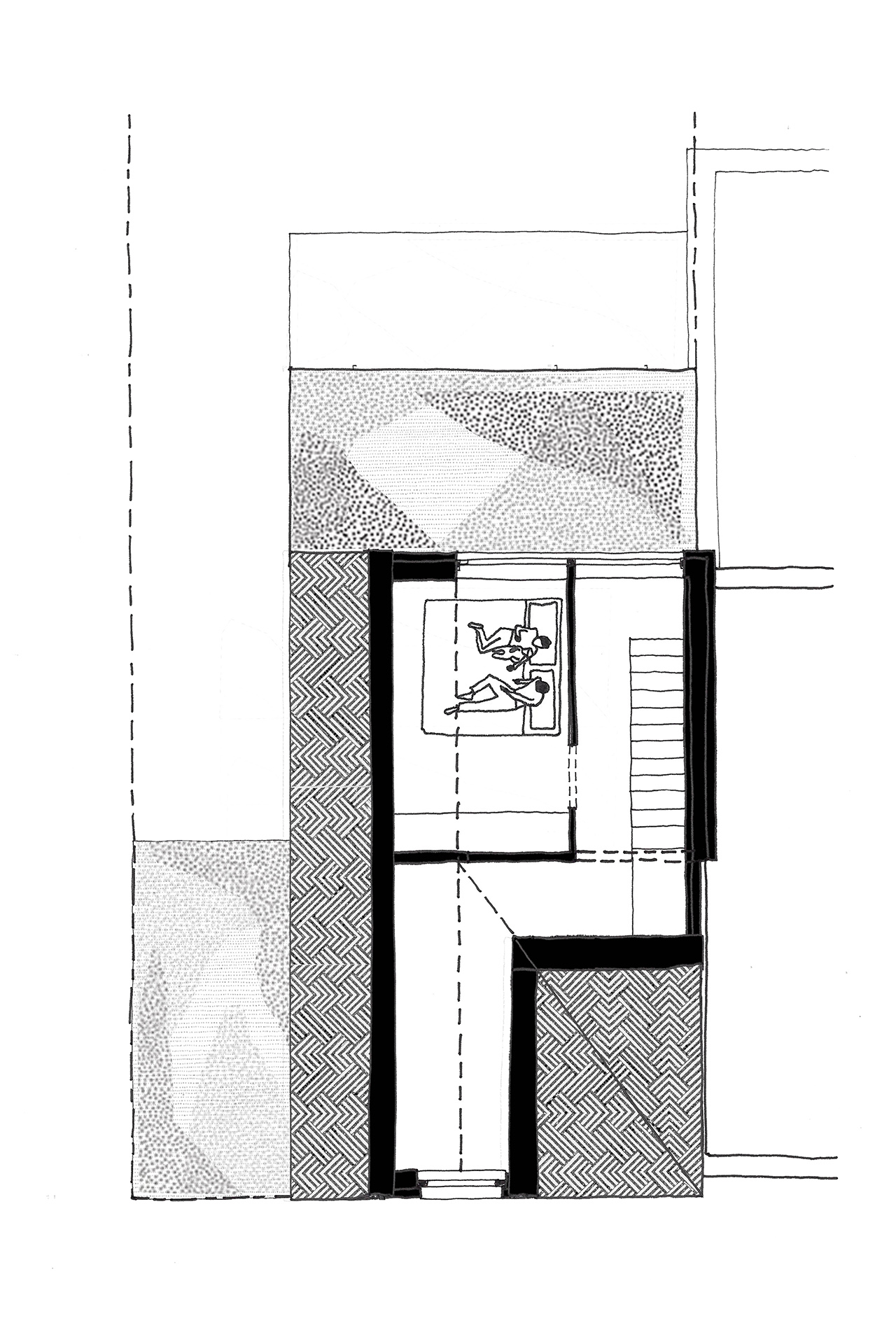 De bestaande gekoppelde woning zou zodanig hard verminkt worden om het gevraagde bouwprogramma te kunnen realiseren dat slopen en weer opbouwen de betere oplossing bleek. Er werd een nieuw volume met een performante isolatieschil ontworpen bovenop de bestaande kelderverdieping. Hierdoor werd het mogelijk om maximaal in te zetten op een doorgedreven ruimtelijkheid met split-levels, interne diagonale zichtlijnen en secuur ingeplante raamopeningen.