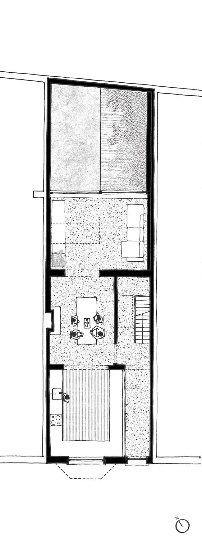 Het ontwerp voorziet in het ontbouwen van het perceel: de badkamer achteraan werd gesloopt om ruimte te maken voor een kleine stadstuin. De grens tussen het hoofdvolume en de achterzijde werd volledig opengewerkt. De stadstuin wordt zo voelbaar voor de volledige gelijkvloerse verdieping. Het oostenlicht kan hierdoor ook dieper doordringen in de middenruimte. Een nieuw daklicht versterkt dit nog een geeft een broodnodig zicht op de lucht.